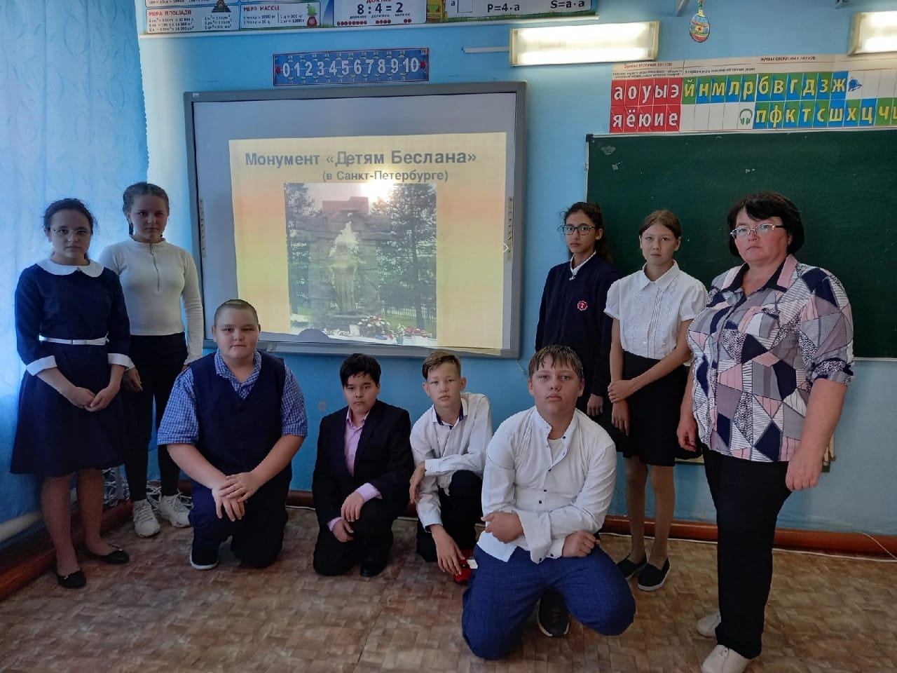 В рамках профилактики экстремизма и терроризма библиотекарь Закиева С.В. провела в 7 классе библиотечный урок "Помним тебя, Беслан!"