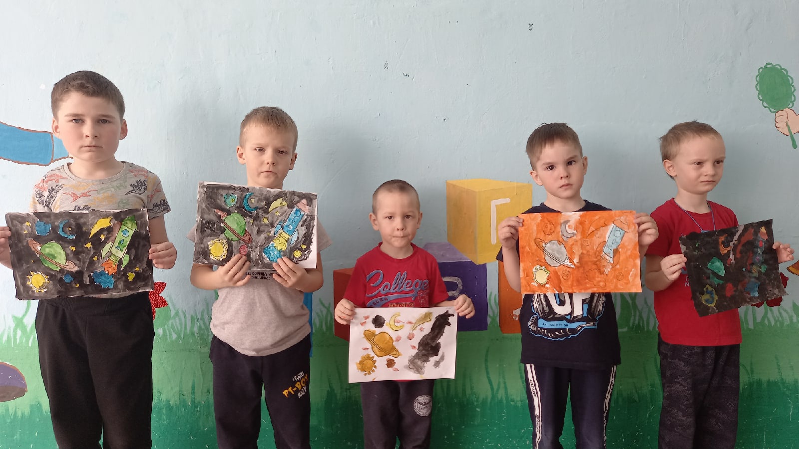 Для расширения кругозора в группе были использованы иллюстрации о планетах, космонавтах спутниках, созвездиях. В беседах с педагогами дети узнали о человеке, покорившем космическое пространство- Ю. Гагарине, первой женщине космонавте В. Терешковой, о том как четвероногие друзья человека проложили путь к звездам, о планетах больших и маленьких, об их свойствах. Свои знания и умения дети закрепили в творческих работах.